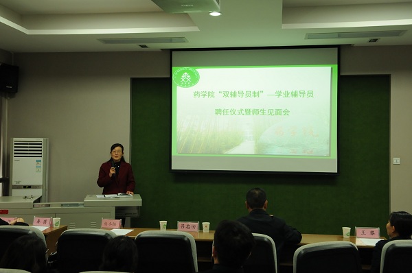 药学院院长秦蓓宣布了29位学业辅导员聘任名单。在宣布名单之前,秦蓓院长针对此项工作谈了几点感受。她讲到:药学院从“五进”公寓工程制定出属于药学院 “一院一品”的“双辅导员制”全员育人格局,一步一个脚印,一路走来,离不开校党委的关心与支持,离不开药学院全体同仁的努力。为此,秦蓓院长希望药学院与会师生认真领会实行“双辅导员制”的重要意义,药学院全体同仁要秉持“务实拼博,博爱谦雅”的精神,充分发挥“双辅导员制”的育人作用,同心同德,砥砺前行,培养出优秀的社会主义建设者和接班人。校党委副书记熊冬梅为29位学业辅导员颁发了聘书。曹璞老师代表学业辅导员做表态发言。曹璞老师坚定地表态:“在未来承担学业辅导员的工作中,将一切以学生为中心,在思想上关心学生,帮助其树立正确的人生观和价值观;在生活上关爱学生,帮助其解决生活困难;在学习上辅导学生,帮助其掌握扎实的理论知识和实践技能;在专业上启迪学生,帮助其成为学以致用的专业性应用型人才,担任好学业辅导员,不辜负学校和学院的期待”。
