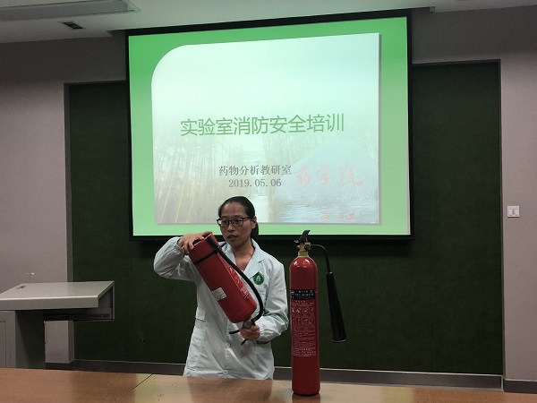 分析测试中心实验室管理员李金娟示范灭火器使用