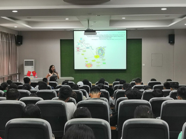 李教授首先通过目前已上市获批抗癌药物喜树碱抗癌作用机制出发,提出目前抗癌药物诱导细胞死亡并抑制癌细胞的增殖的主要机理在于干扰阻断癌细胞分裂而发挥药效,癌细胞的抗药性,抗癌药物与金属离子结合开发疗效更好的抗癌药物等方面介绍抗癌药物发现、改造及作用机制研究,将深奥复杂的科学研究运用生动的语言,深入浅出的为师生做了分享介绍,现场学术氛围浓厚,交流互动热烈。通过此次讲座,激发了学生们的科研兴趣,锻炼了学生应用中英文与专家交流表达的能力也有力促进了我校广大教师科研思路拓展以及科研水平的提高。(药学院 文/徐小静 图/杨宽)