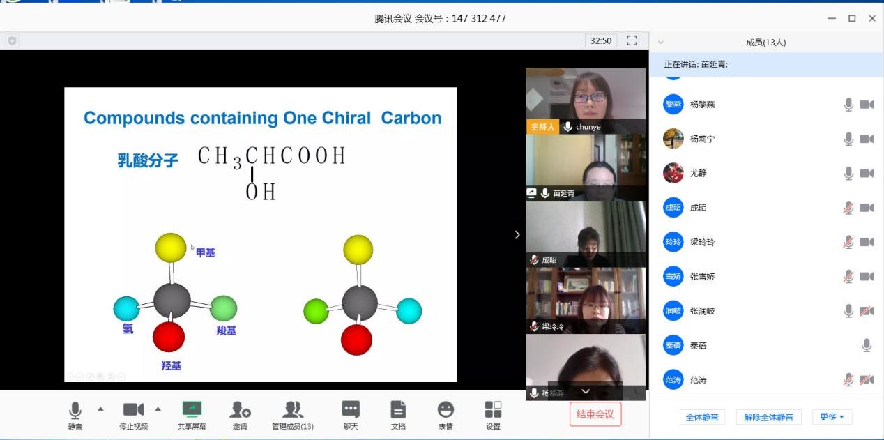 3月18日下午14:00,在校级教学督导张润岐教授、院长秦蓓教授、副院长冯永辉教授的指导下,化学教研室全体教师借助腾讯会议平台的多人视频对话、实时屏幕分享等功能,就《有机化学》课程线上教学中的“旋光异构”问题,进行了一次别开生面的集体备课活动。