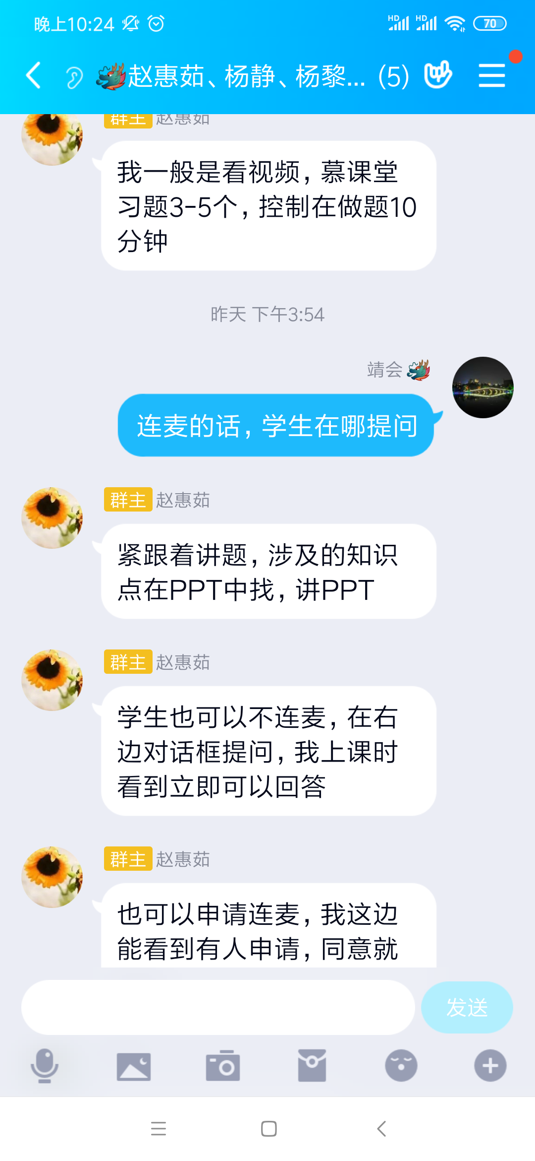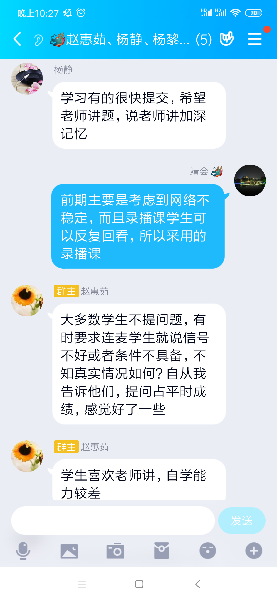 通过讨论,大家一致认为,结合中国大学MOOC的视频资源,结合慕课堂的签到和课堂练习,再进行一定时间的直播,授课效果比较好。开启直播,对重点、难点进行强调,并对学生的疑难问题进行答疑,可以让学生对知识理解的更透彻。直播的过程中,点名学生回答问题,可以更好的提高学生的参与度。大家纷纷表示,要在后面的课程中进行尝试。
