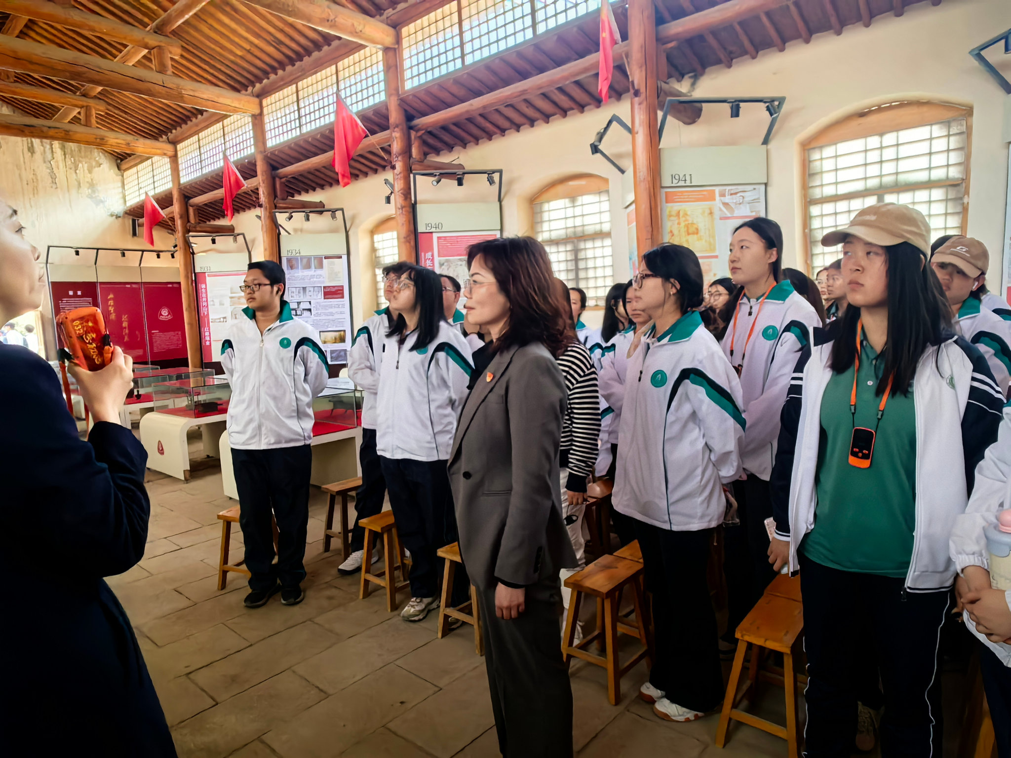 抵达后的首站是延安革命纪念馆。师生们驻足徘徊在一件件斑驳的文物、一幅幅发黄的照片、一幕幕感人的复原场景前,感受党中央在延安的十三年那段铭刻着血与火的记忆和波澜壮阔的岁月,它如同一座灯塔照亮了每个人的眼眸,照进了每个人的内心。