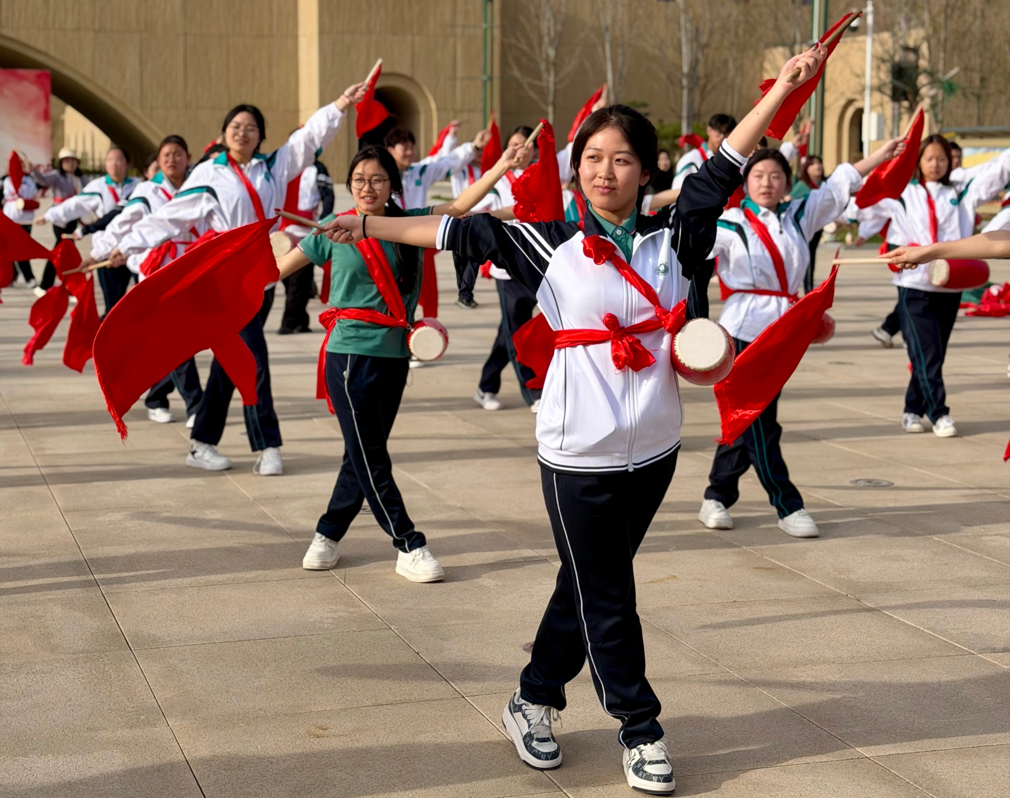 火红的腰鼓敲起来、火红的绸带飘起来,在安塞腰鼓非遗体验中师生们用激情与豪迈把“红色”写进了舞步,民族风格与地域特色在交相辉映间让古老秧歌焕发出最明亮的时代色彩,一种精神也在这震天的鼓声、欢乐的舞步中传承、延续。