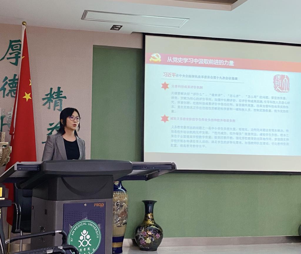 宣讲活动以秦蓓院长的党课《党史学习与立德树人要求同进并举》及支部书记杨黎彬的党课《党史学习的目的和意义》为主要内容进行。秦蓓院长首先通过新中国成立以来我国教育工作之路的介绍,对党史中涉及教育的重大事件及人物进行了回顾,之后结合现在的大学教育工作对全体党员提出了青年人才要自觉锤炼科学精神,以及从党史学习中汲取前进力量的工作要求。杨黎彬书记结合党在一百年的发展壮大过程中遇到的困难、挑战对党史学习的重要目的及意义进行了深入的讲解。
