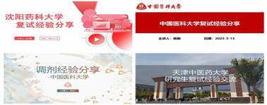 接下来,在“校友云端分享”环节,近年考取三校的四位优秀校友分别进行了复试经验分享。来自天津中医药大学中药学专业的王鑫以自身经历为例,拆解了该校复试中面试和笔试环节的具体细节,并建议各位考生对本科阶段的科研工作或本科毕业论文内容做到了熟于心;沈阳药科大学药理学专业李泽鹏分享了专业英语文献翻译与专业能力面试的考核要点,并对面试着装以及可能出现的压力测试进行了说明;中国医科大学药剂学专业的杨敏指出,该校对于英语成绩单独划线、要求较高,复试成绩与初试成绩各占50%,较其他院校更凸显了复试的重要性,此外,他还提到,该校多数专业复试阶段不设置笔试,综合面试的临场应变和知识储备变的尤为重要;同样就读于中国医科大学药理学专业的陈琳,着重分享了自己成功调剂该校的经验,她通过分析自己一志愿复试失利之后的心路历程,特别强调了主动联系目标院校研招办获取动态信息的重要性,鼓励大家要相信自己、有始有终、沉着应对,最终定能收获好的结果。