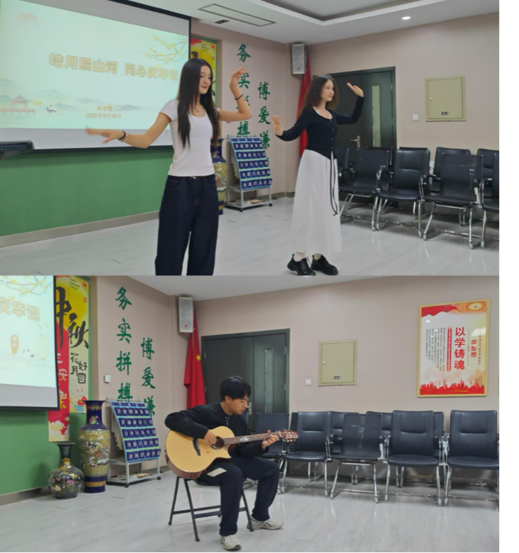 茶话会在同学们轻松的自我介绍中拉开序幕,来自维吾尔族、回族、蒙古族、苗族、汉族等多个民族的学生一边交流分享,一边品鉴月饼、水果与陕西特色美食,气氛温馨而热烈。交流环节中,高年级学生结合自身经历,围绕学院关怀、学业发展、校园生活等方面表达了对学校和学院的感恩之情;2025级新生也踊跃发言,纷纷表达了对未来大学生活的美好期待。阿丽达、玛尔孜艳两位同学表演了舞蹈《新疆姑娘》,以优美的舞姿和浓郁的民族风情,展现了新疆文化的独特魅力;马成祥同学的吉他弹唱《晴天》引发全场共鸣,师生轻声应和,在旋律中凝聚情感,洋溢着民族团结的和谐氛围。